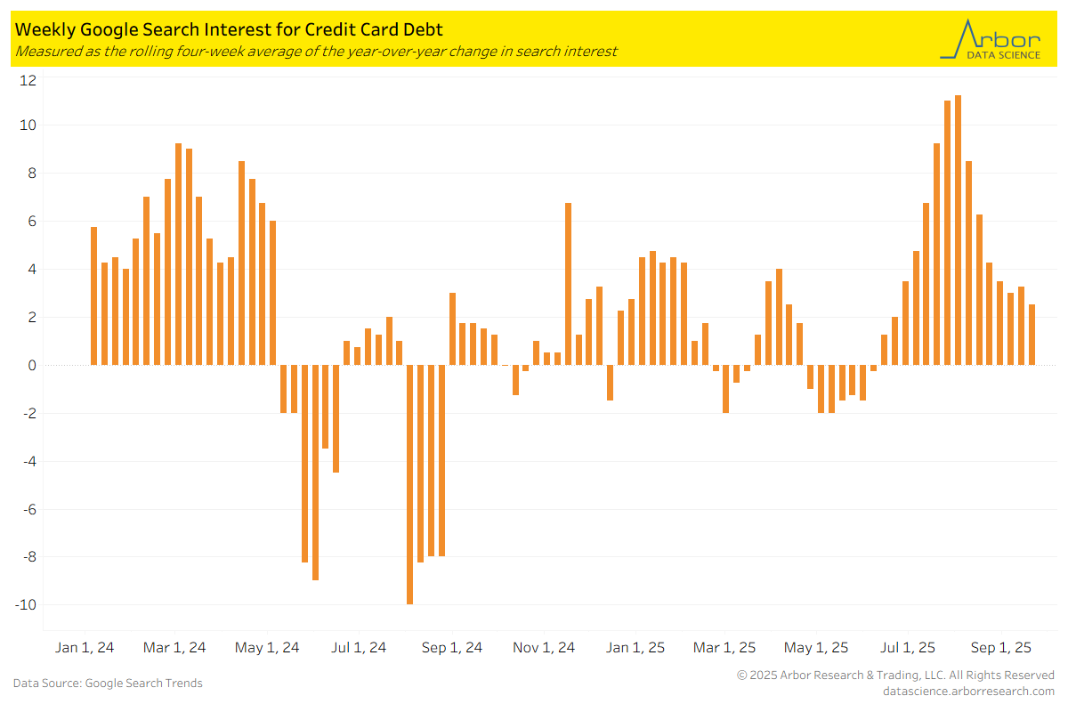 - For the week ended on 9/28/2025, the term credit card debt had a positive year-over-year change in the number of hits at 2.5.