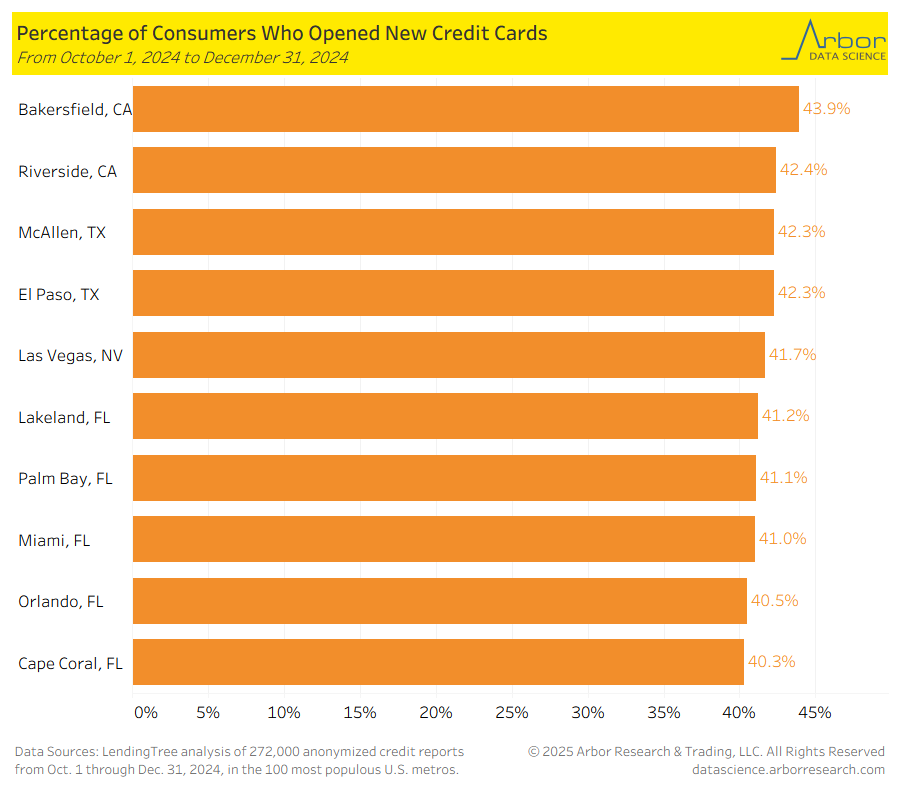 - The last chart below outlines the metros with the largest percentage of consumers who opened a new credit card from 10/01/2024 to 12/31/2024.