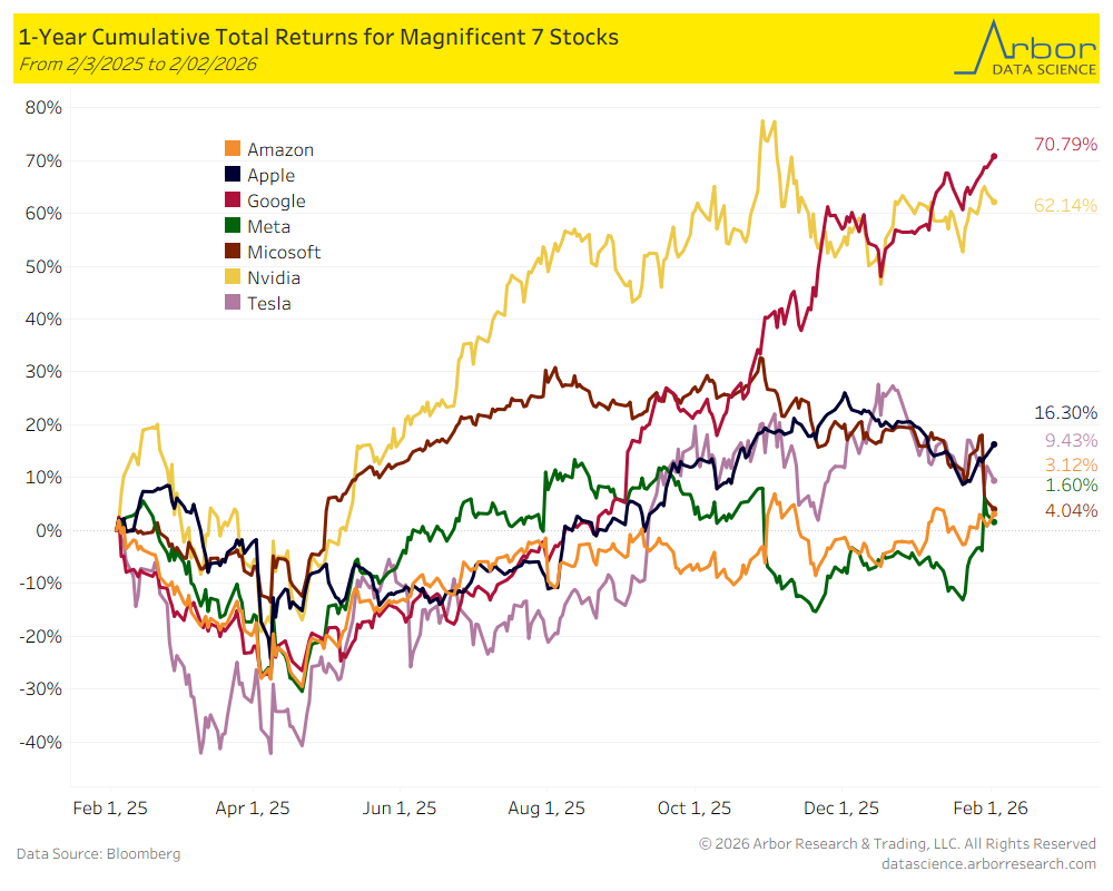 Part of the reason for the dispersion is that the companies do not have the same tailwinds. The two major winners over the past years are exposed to AI, but in ways that largely insulated themselves from the day to day shifts in sentiment around monetization of the technology. Nvidia is the undisputed leader in chips, and Google has a combination of GPU tailwinds and Gemini being a leader in usable AI. Others have struggled to keep up with the boom – either having to spend significant sums of money to build out data centers and keep up or finding themselves in the pathway of potential disruption.