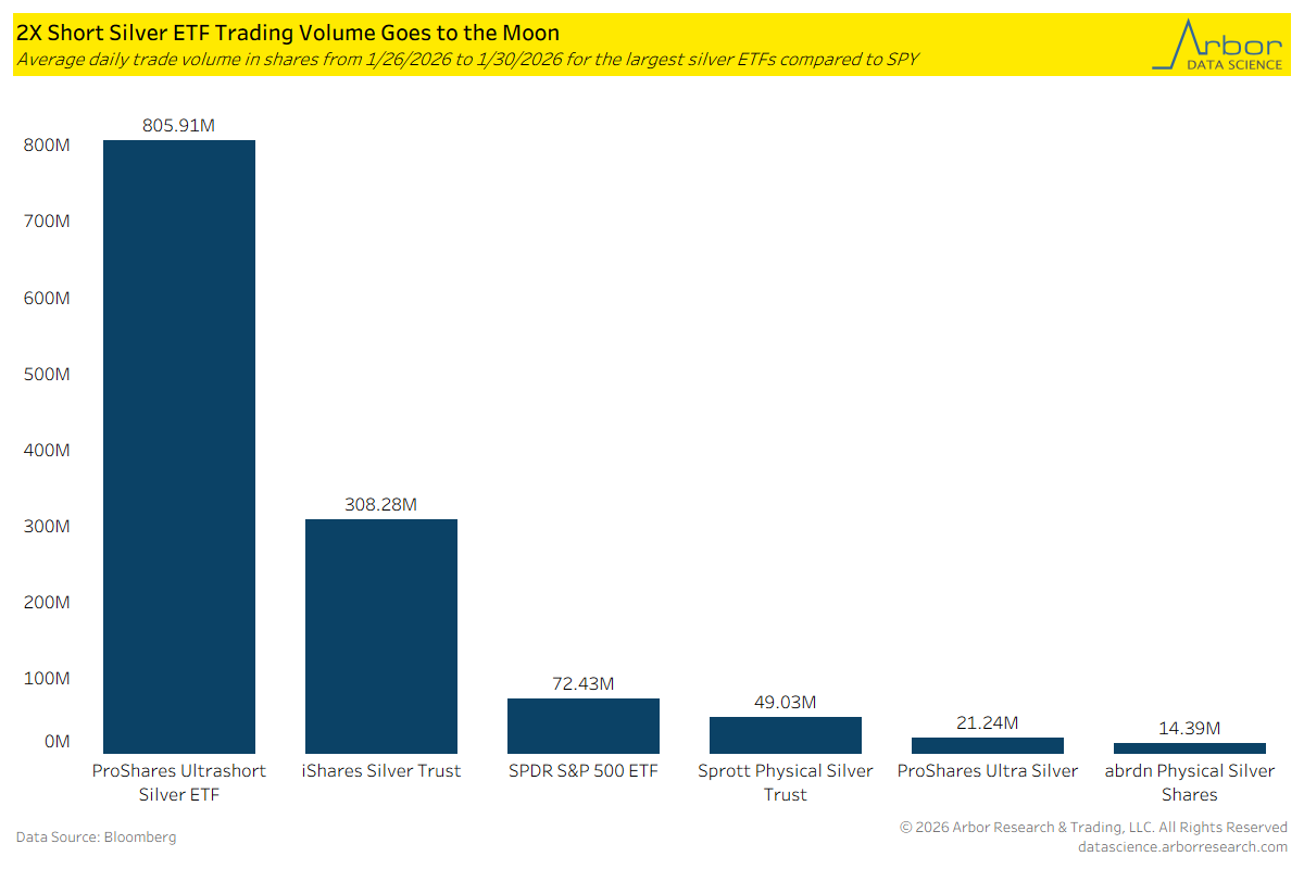 ZSL had an average of 805.91 million shares traded over the past five trading days (1/26/2026 to 1/30/2026). In fact, it has been the top traded ETF on U.S. exchanges each day from 1/26/2026 through 1/30/2026. The only trading day of 2026 in which ZSL was not among the top-three most traded ETFs was the first market day of the year, 1/2/2026, when it finished fourth with a volume of 122.66 million shares.