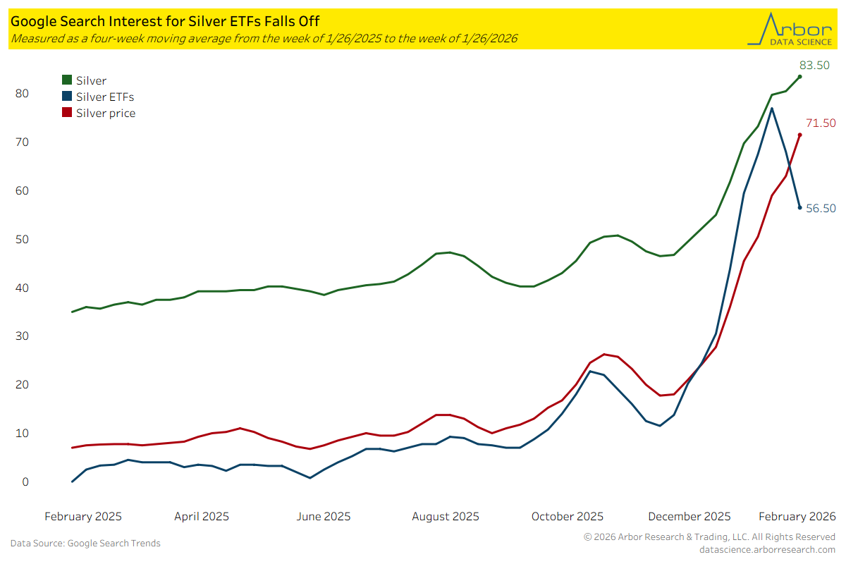 The Google Search Interest for terms related to silver increased throughout 2025, but they have started to diverge recently. The four-week moving average for “silver ETFs” decreased to 56.50 for the week starting 1/25/2026. This is the second consecutive week of a decrease after peaking at 77.00. The moving average of interest for “silver price” and “silver” have continued upward, and were at 71.50 and 83.50 respectively.