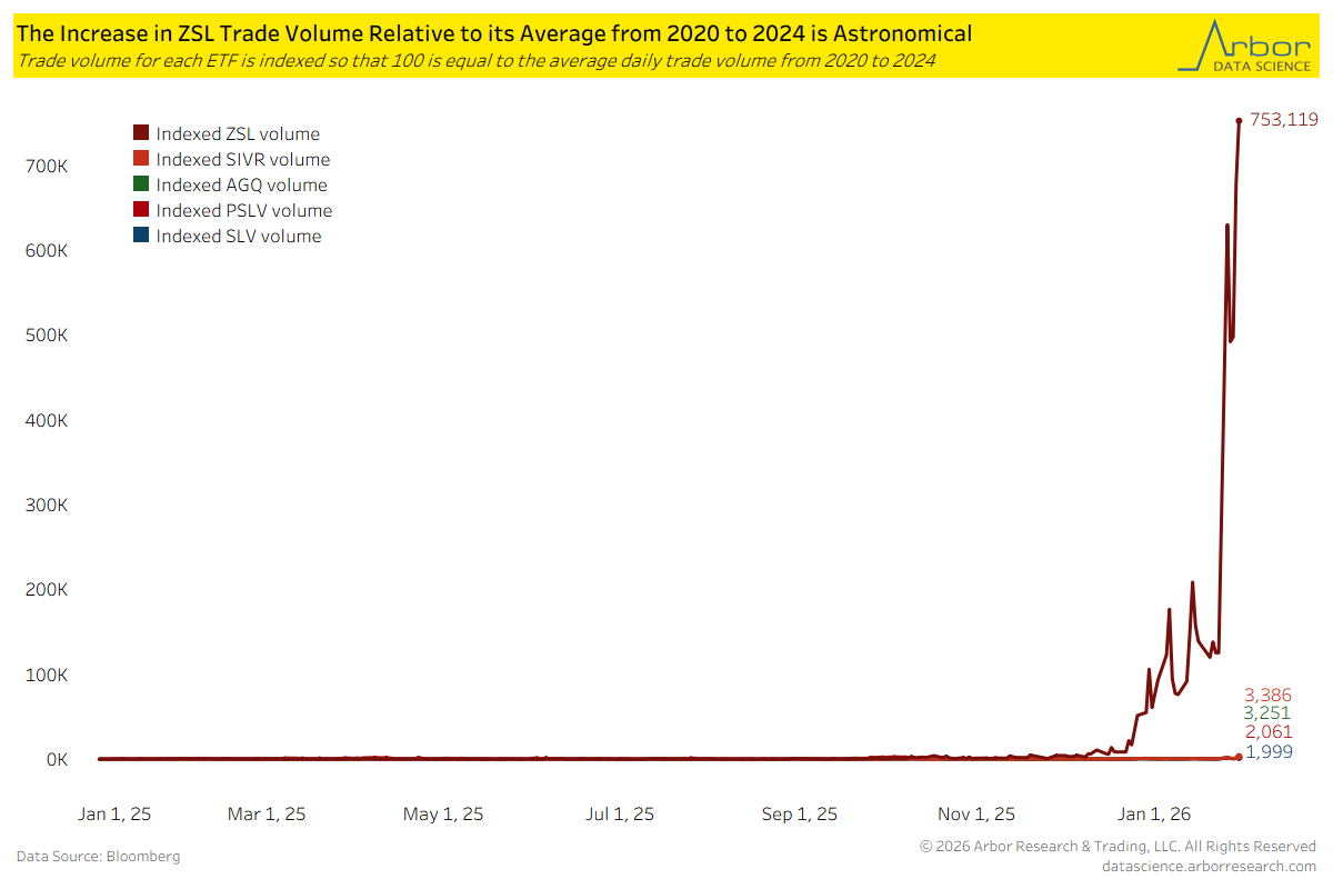 Each of the four non-bearish silver ETFs had trading volume on 1/30/2026 between 1,899% and 3,286% greater than its 2020 to 2024 baseline. However, this is dwarfed by the 753,019% increase in trade volume for ZSL relative to its baseline.