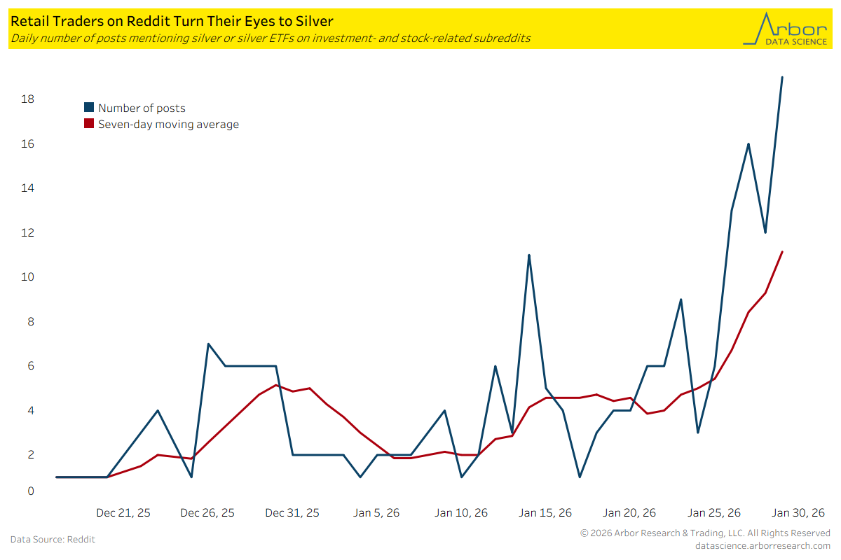 There has been an uptick in the number of posts discussing silver or silver ETFs across investment- and stock-related subreddits over the past week. Yet, it is not as significant as the surge during the GameStop Mania of 2021.
