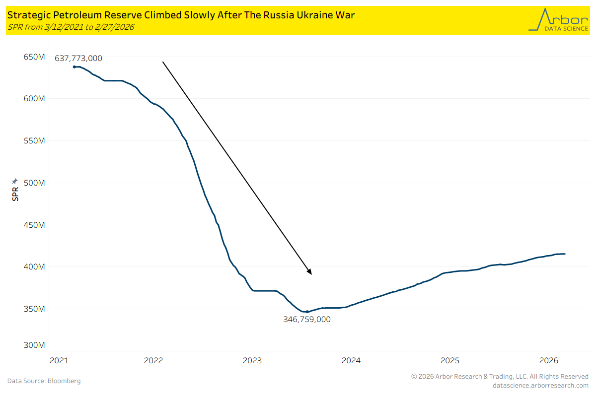 The U.S. has made consistent progress in rebuilding the Strategic Petroleum Reserve (SPR) following shocks from the Russia-Ukraine War. As of February 27, 2026, stockpiles had recovered to 415,441,000 barrels.