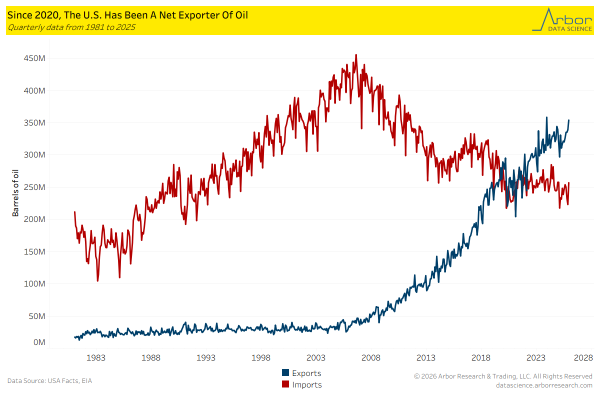 The U.S. has slowly shifted to becoming a net exporter of oil. From 2020 to 2025, the U.S. had exported more barrels of oil than it imported, a sign of strong domestic supply.