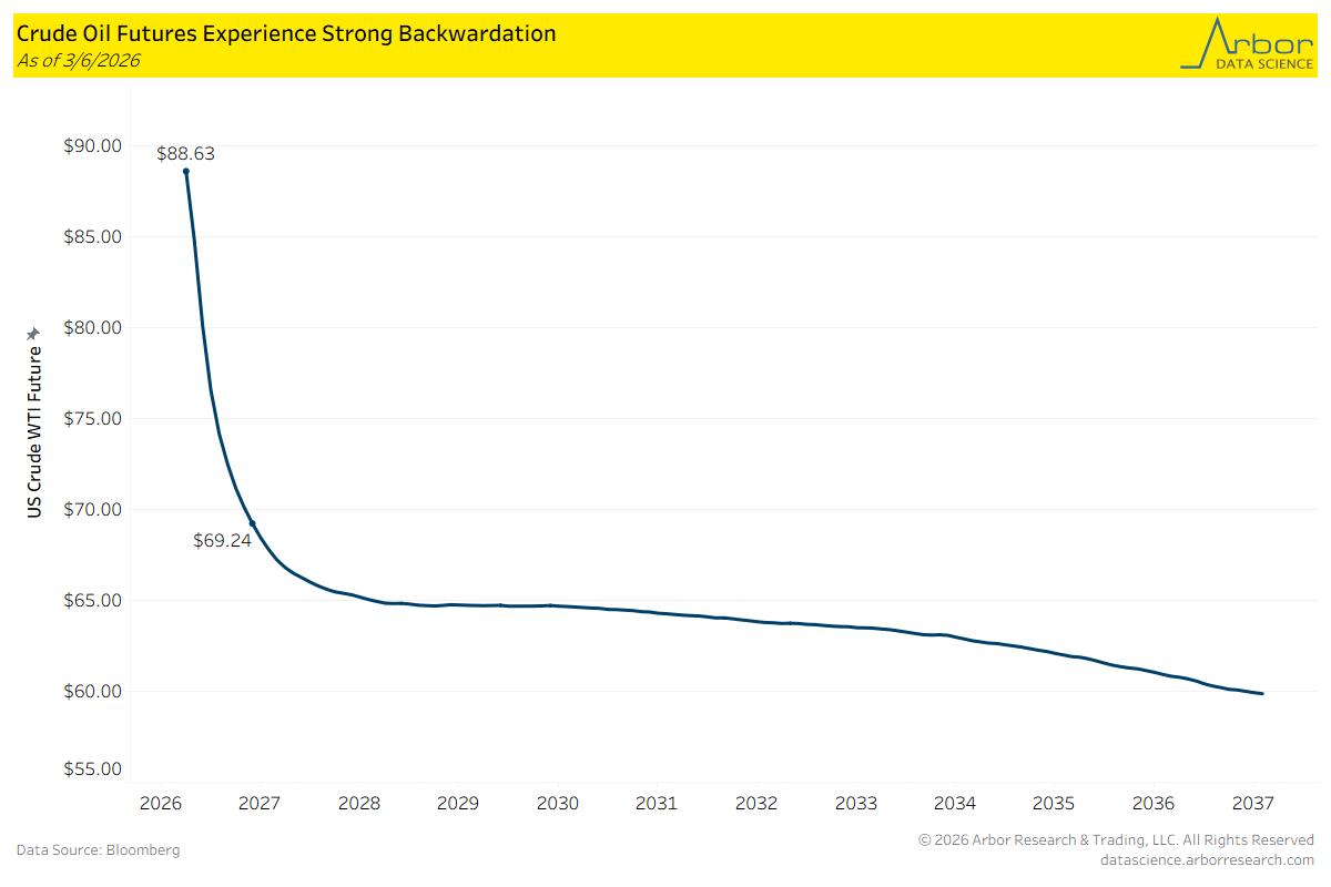 Strong backwardation in WTI crude oil futures indicates that traders believe the scarcity in oil supply will be short-lived. The spread between the April contracts and December contracts was nearly $20.
