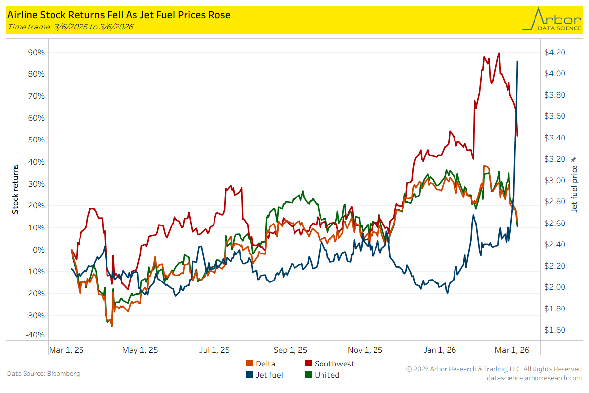 Although Delta, Southwest, and United all posted strong one-year performances, the surge in jet fuel prices — closely linked to oil prices — has eroded these gains. One-month performance for all three airlines was negative, hovering between -14% and -18%.