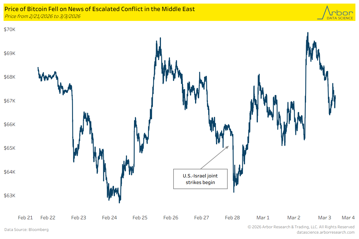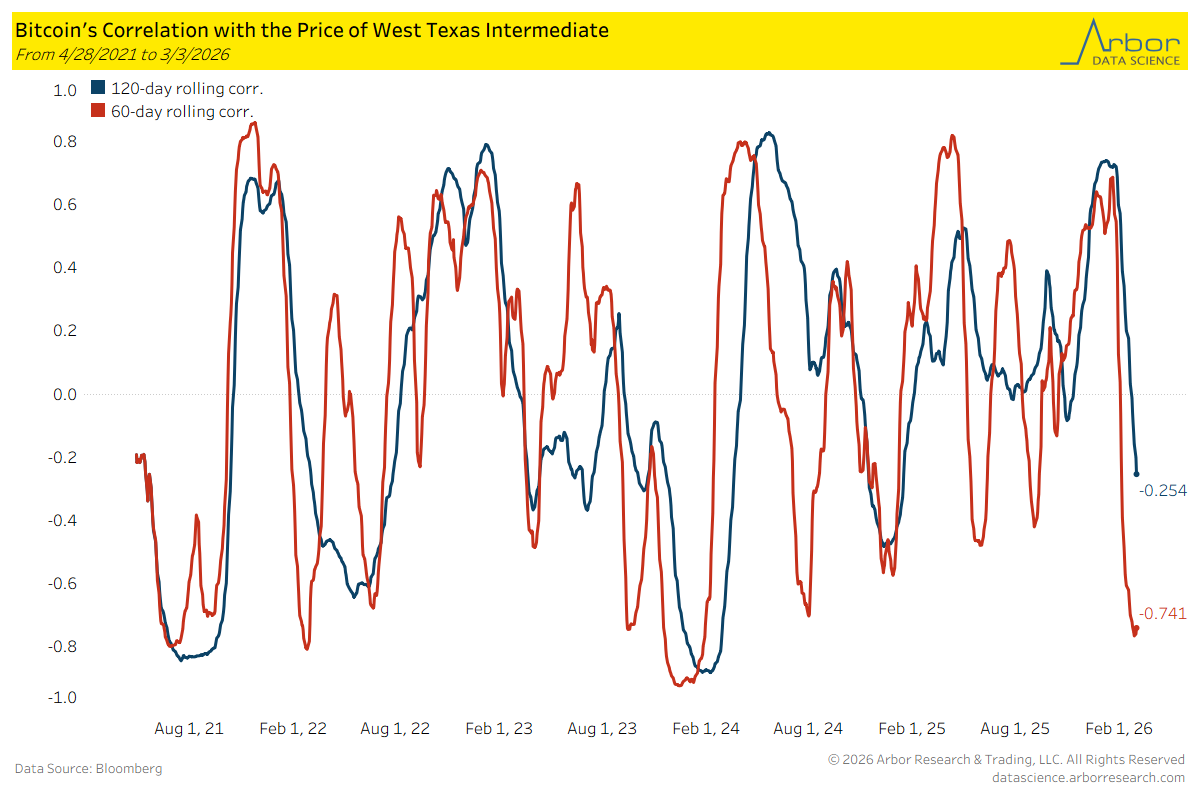 - The price of Bitcoin and WTI had a 60-day rolling correlation of -0.741 on 3/3/2026. This is likely due to the sharp increase in oil prices while Bitcoin’s price has stayed relatively flat.