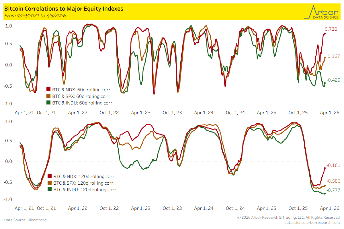 - The 60-day rolling correlation between Bitcoin and the Nasdaq (NDX) was 0.736 on 3/3/2026. This was the strongest correlation of the three indexes.
