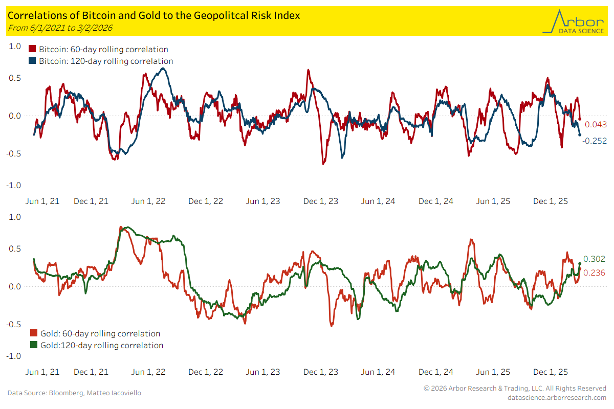 - Bitcoin and the GPR had 60-day rolling correlation of -0.043 on 3/2/2026. The 120-day rolling correlation was lower at -0.252.