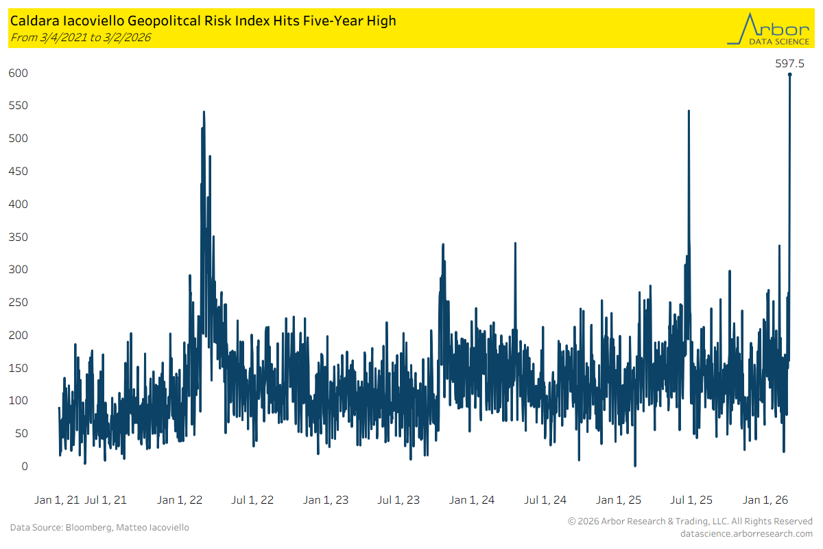 - The Geopolitical Risk Index (GPR) rose to 597.5 on 3/2/2026. This was the highest reading over the period from 3/4/2021 to 3/2/2026.