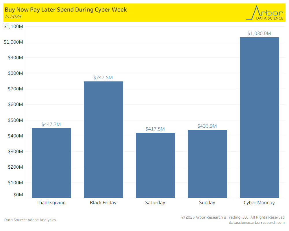 - Utilizing data from Adobe Analytics, the chart below highlights the buy now pay later (“BNPL”) spending during the week of Thanksgiving in 2025. BNPL users used this payment method to spend over $1 billion during Cyber Monday in 2025.
