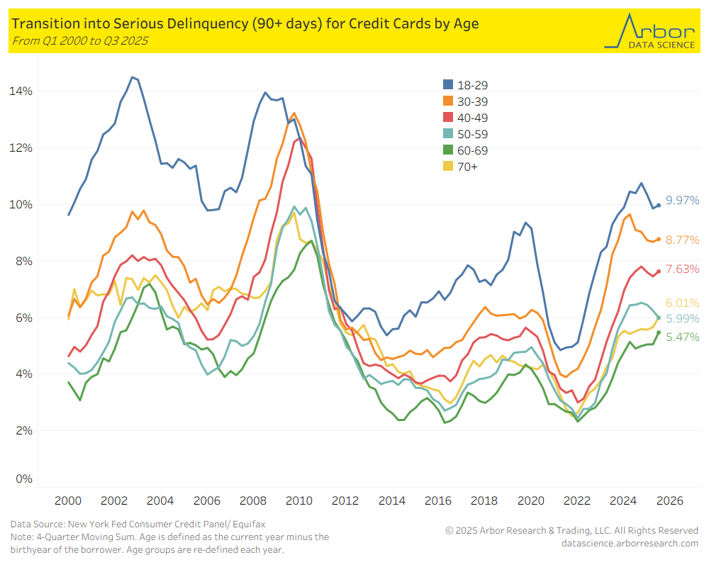 - The chart below outlines the serious delinquency rates (90+ days) for credit cards by age group from Q1 2000 to Q3 2025. All age groups had a uptick in delinquency rates in Q3 2025 from Q2 2025, while the age group 50-59 year olds had the only decline in Q3 2025 from Q2 2025.