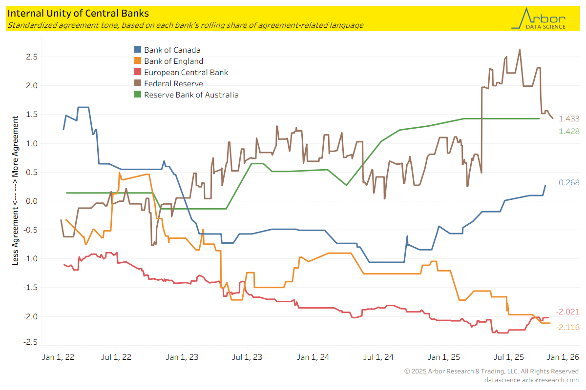 - Despite a difference of opinion at recent FOMC meetings, the Federal Reserve has had the highest levels of agreement in its speeches based on agreement-related language in their speeches when compared to its peers.