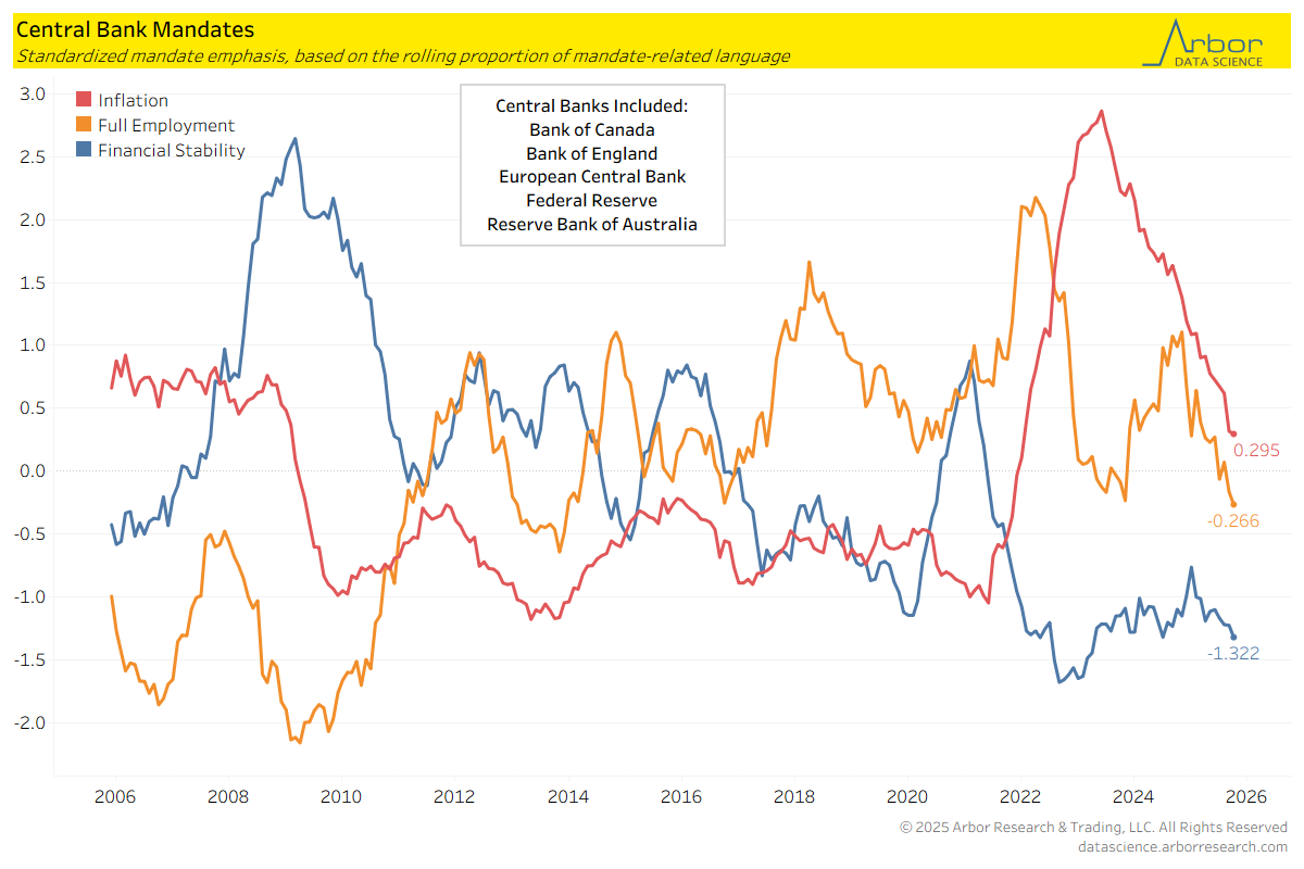 - As of October 2025, inflation was still the main focus in speeches for these five Central Banks. However, the proportions of discussions around inflation have decreased since its peak in the pandemic.