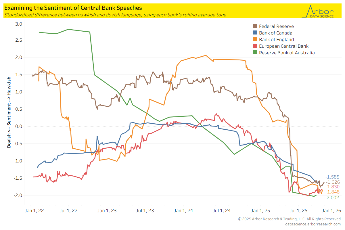 - This most recent update illustrates that the Reserve Bank of Australia was the most Dovish of these five Central Banks, while the Federal Reserve was the least dovish as measured by the difference between hawkish and dovish language in speeches.