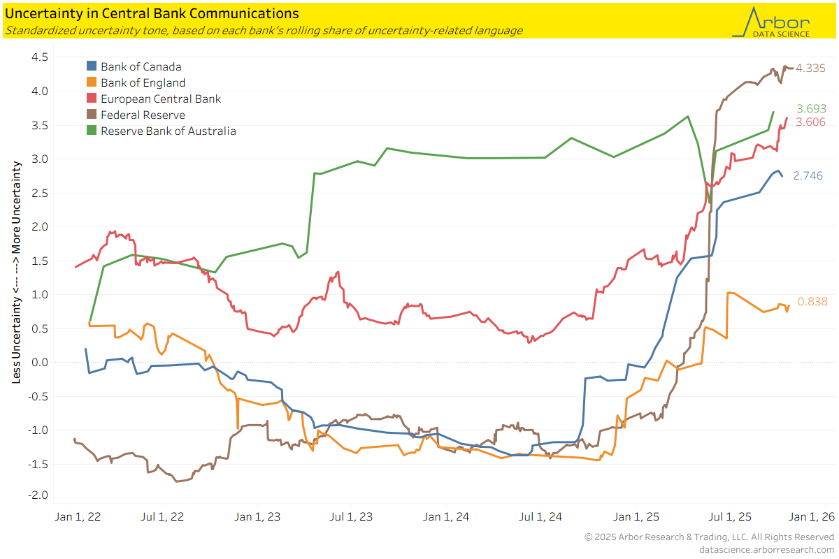 - With data through 10/30/2025, the Federal Reserve had the highest measure of uncertainty in their speeches based on the relative use of uncertainty-related language. The Federal Reserve had the lowest levels of uncertainty to start 2025.
