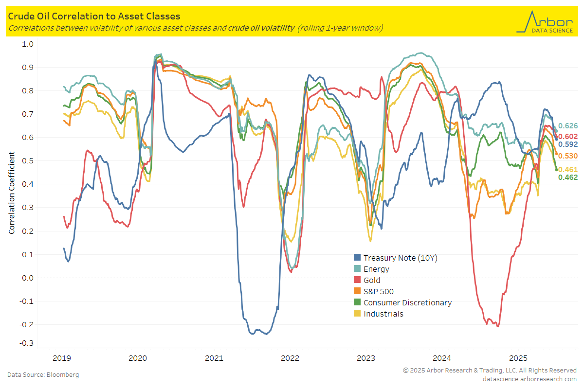 - As of 7/2/25, the Energy asset class is the most correlated to crude oil volatility, with a correlation coefficient of 0.626.