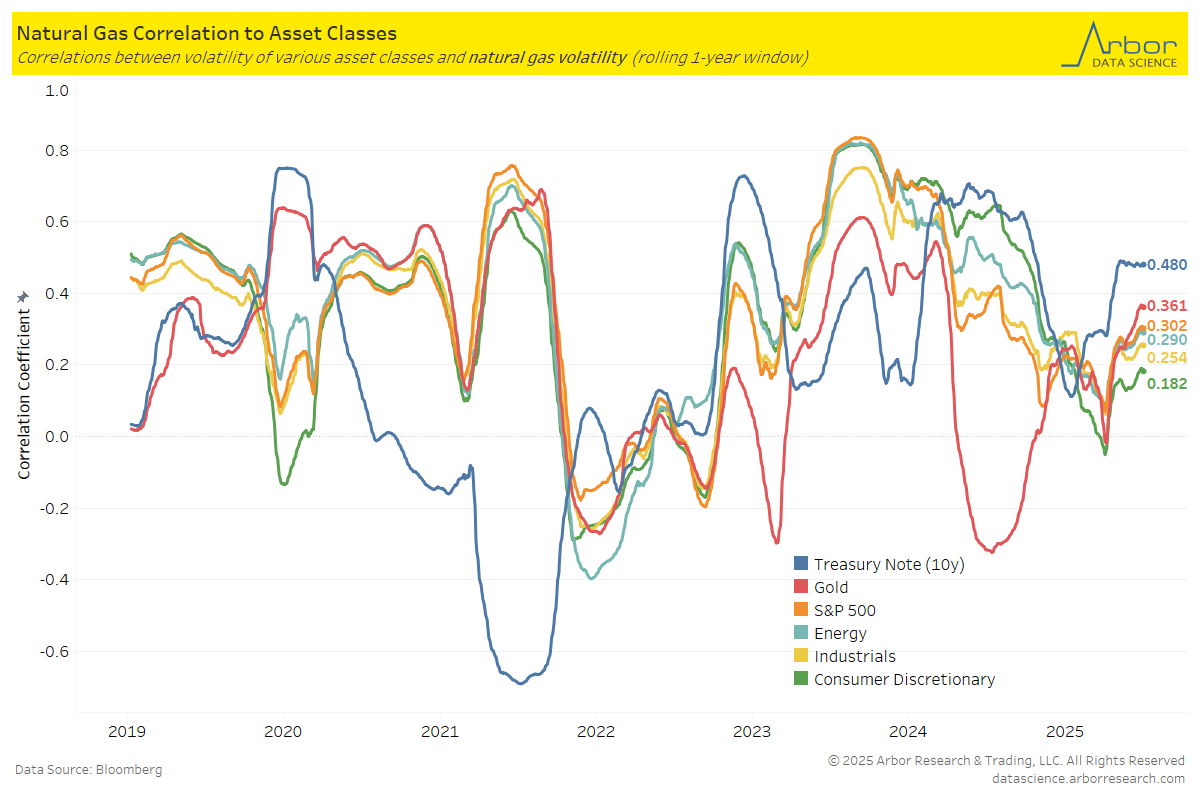 - As of 7/2/25, the 10-year Treasury Note volatility is the most correlated to natural gas volatility, with a correlation coefficient of 0.480.