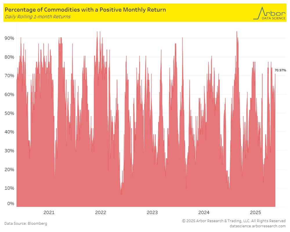 - The percentage of all commodities with a positive monthly return increased to 70.97% on 7/2/25 from 51.61% the previous week (6/23/25-6/27/25).