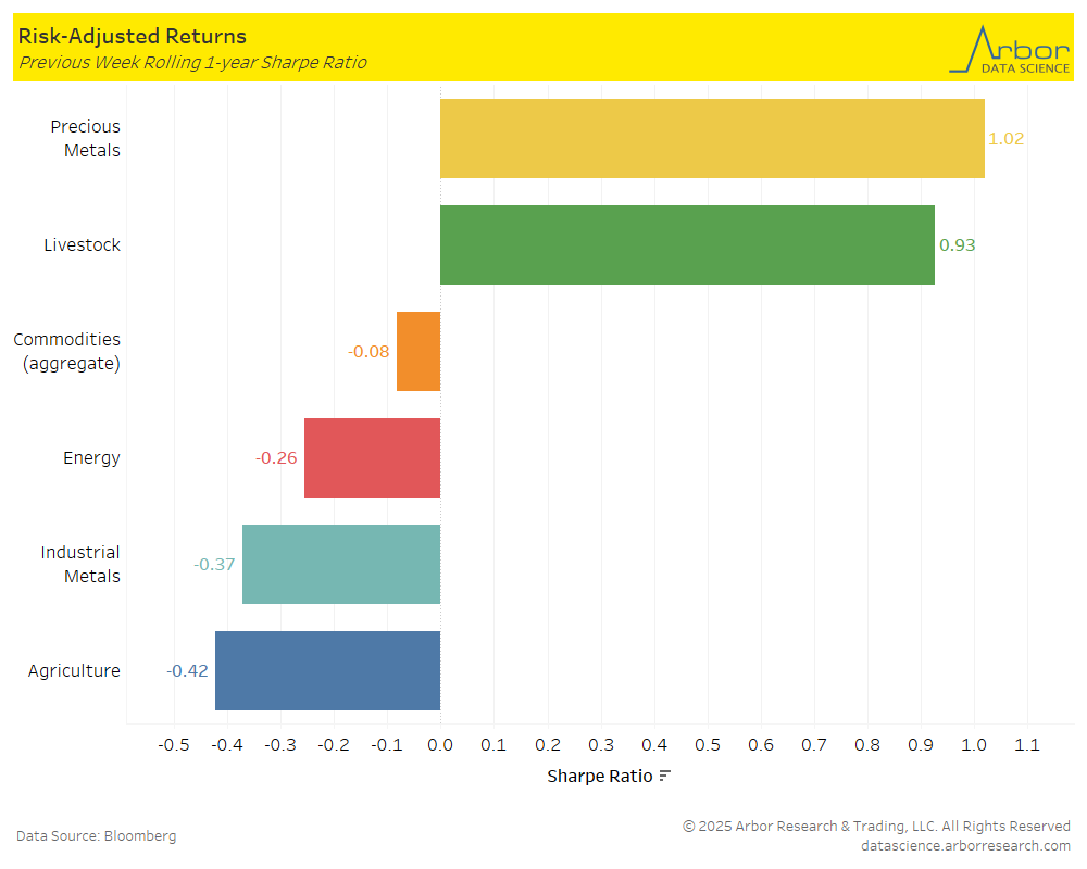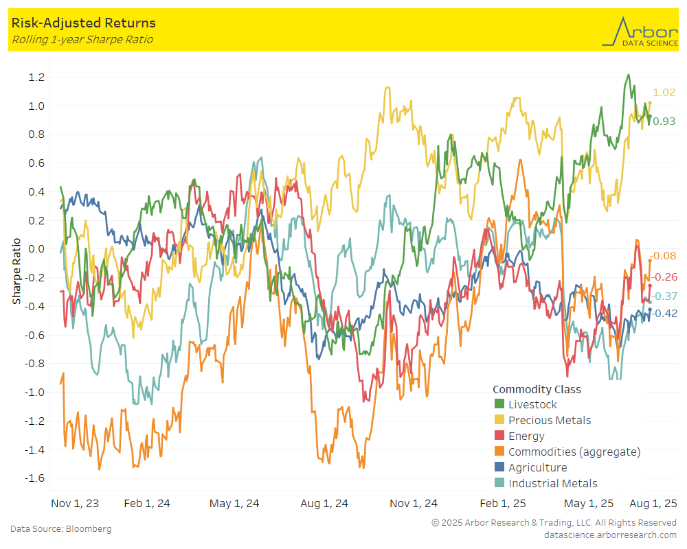 - The first chart below outlines the week-over-week (6/30/25-7/3/25) aggregate Sharpe ratio for commodities. It was -0.08 compared to -0.29 the prior week. The second chart is a rolling 1-year aggregate Sharpe ratio for commodities.