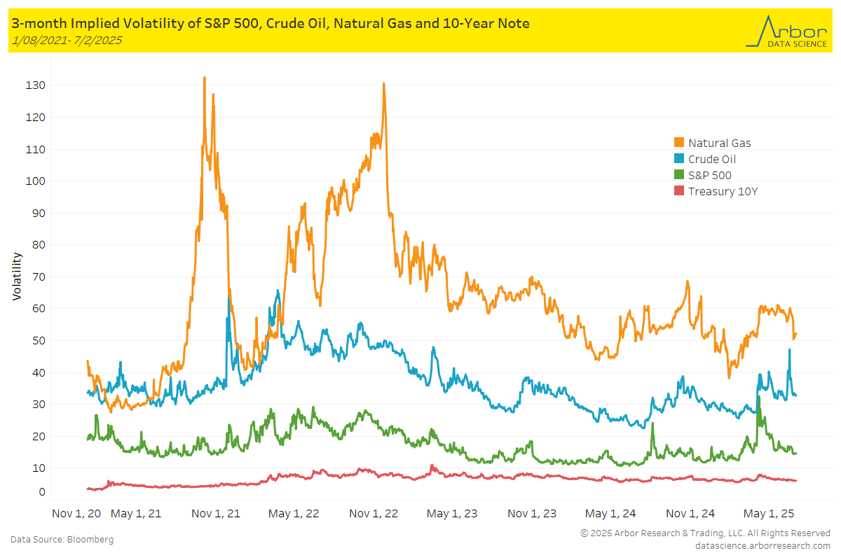 - The chart below highlights the 3-month implied volatility of the S&P 500, crude oil, natural gas, and the 10-Year Note as of 7/2/25.