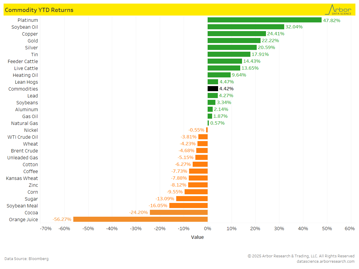 - YTD returns for commodities are shown in the chart below. Platinum had the highest YTD return at 47.82%, followed by Soybean Oil at 32.04% and Copper at 24.41%.