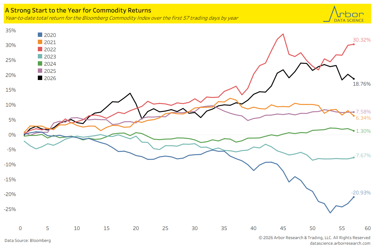 - Through the first 57 trading days of the year, the Bloomberg Commodity Index had a total return of 18.76%. This was the highest level of returns in this period since 2022, when the index had a return of 30.32%.