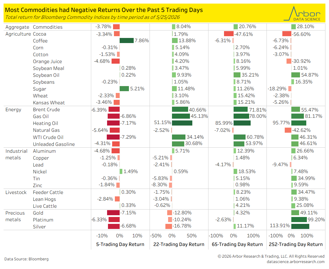- 23 of the commodity indexes had negative total returns over the past 5 trading days, with the largest drawdown in WTI Crude Oil, at -7.29%.