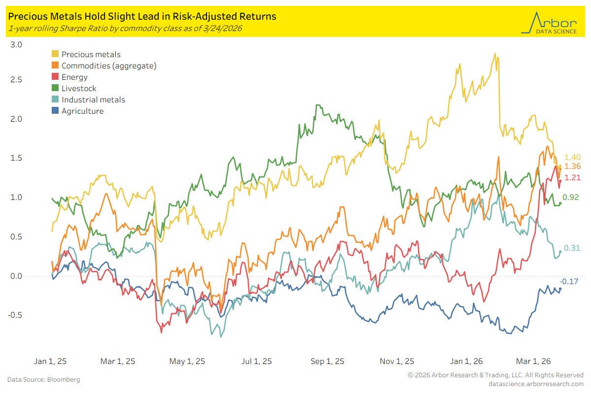 - The precious metals class, which includes gold, platinum, and silver, had a 1-year rolling Sharpe Ratio of 1.40. This was the highest of six commodity included in the chart below.