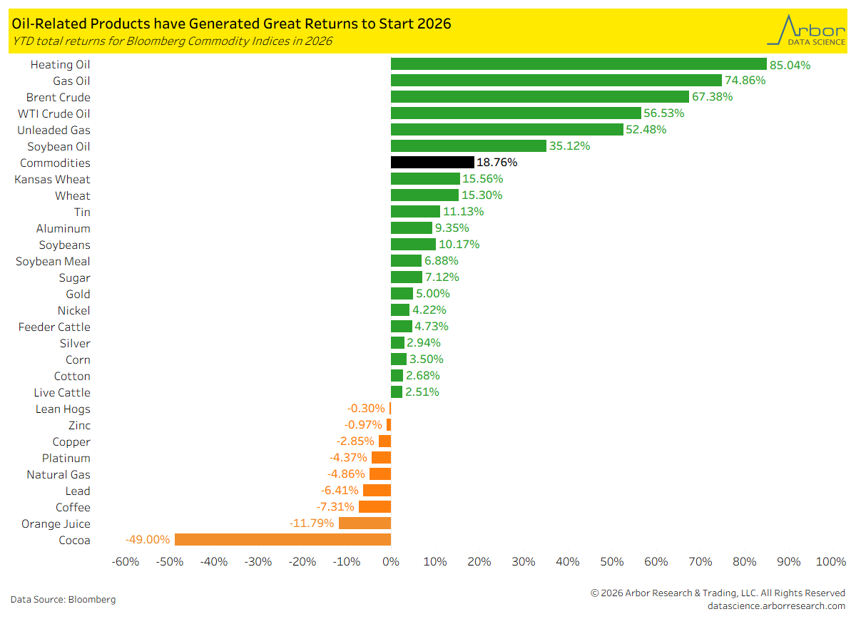 - Of the 30 Bloomberg commodity subindexes charted below, 21 had positive YTD total returns.