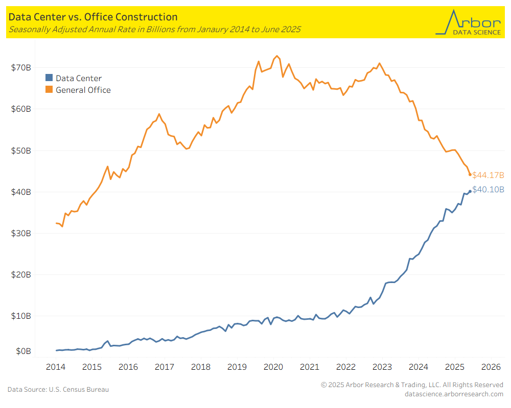 In the last three years alone, data center construction spending has nearly surpassed that of office buildings. My base case is that it will exceed office building construction in 2026, and if AI achieves even one-tenth of its potential, general office construction will remain quite low until the next “fundamental” shift in our global economy.