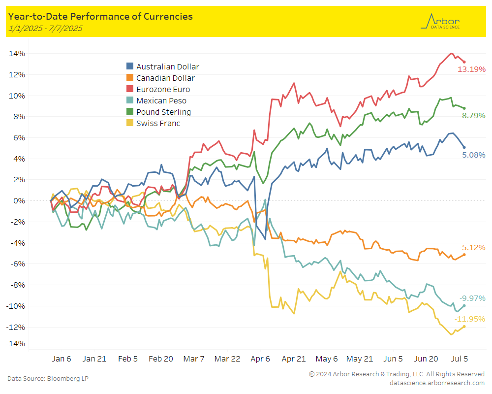Below is a chart of the Dollar Index over the past year, along with the relative performance of G10 currencies.