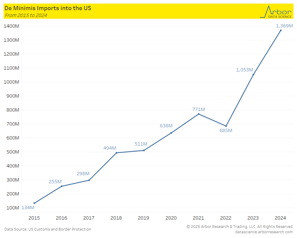 - There were $1.369 billion worth of imports falling within the de minimis exemption in 2024, more than ten times the $134 million in 2015.