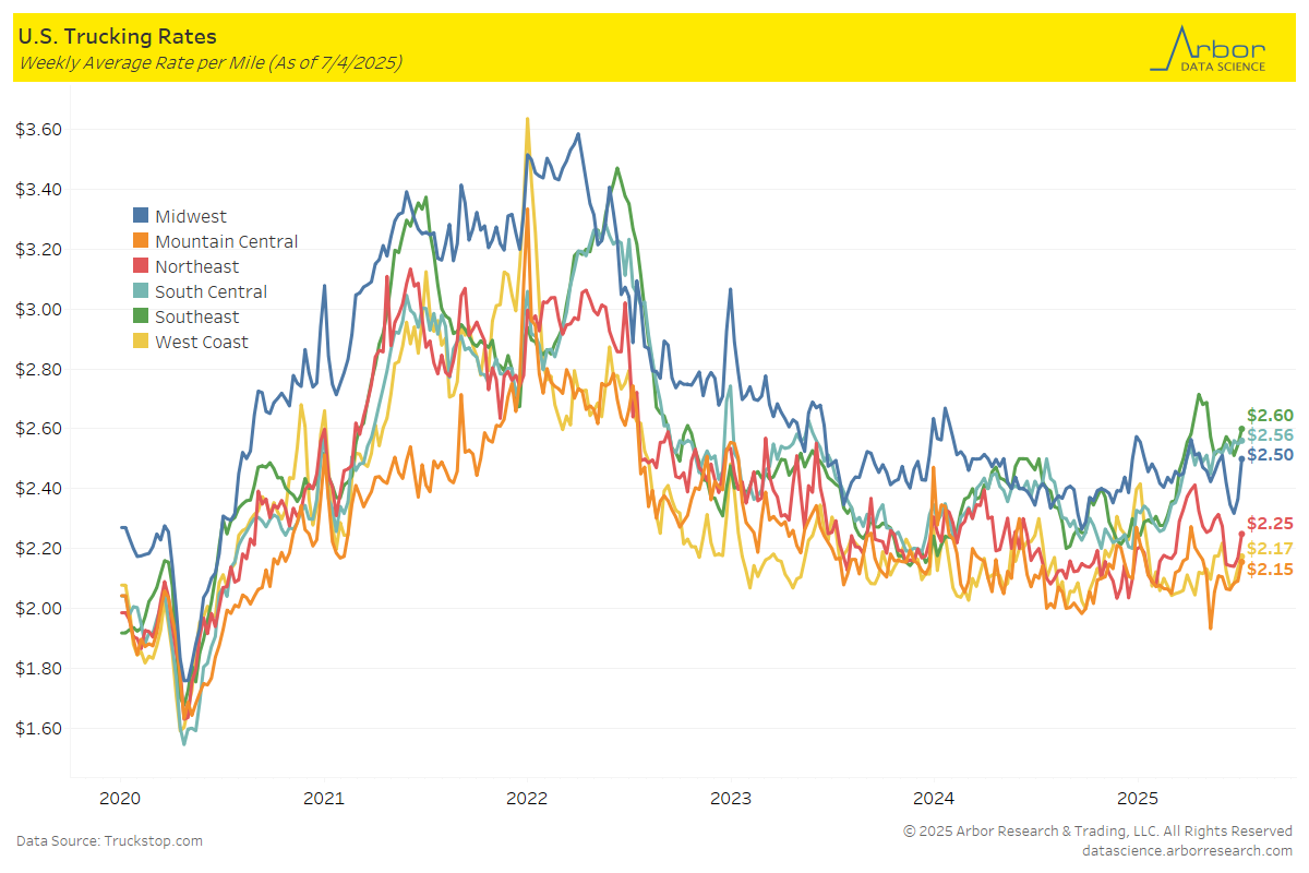 - Trucking rates on a geographical basis increased last week. The largest increase was in the Midwest region which increased $0.14 to $2.50 per mile. The second-largest increase was in the Northeast region which increased $0.08 to $2.25 per mile.