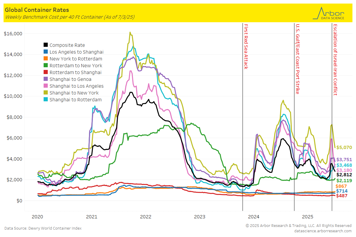 - The composite rate per 40-foot container was $2,812 on 7/3/25, which is down $171 from the previous week. Global container rates were mixed week-over-week. The largest decrease was from Shanghai to New York, which decreased $633 to $5,070. The second-largest decrease was from Shanghai to Los Angeles, which decreased $561 to $3,180.