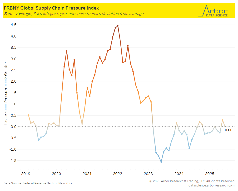 - The Federal Reserve Bank of New York’s Global Supply Chain Pressure Index (GSCPI) decreased from 0.30 in May 2025 to 0.00 in June 2025.