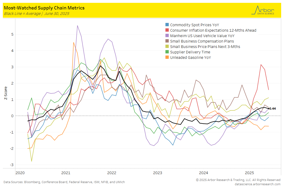 - The aggregate index of most-watched supply chain metrics (the black line in the chart below) was 0.44, with zero meaning the supply chain is acting normally.