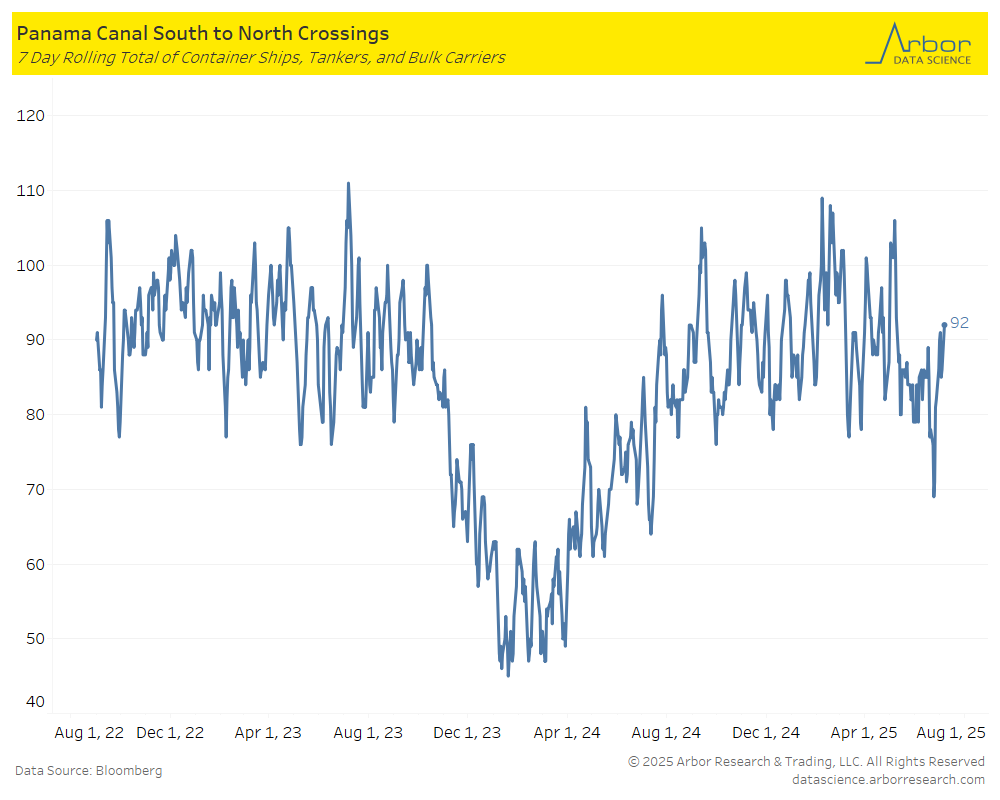 - The chart below outlines the 7-day rolling total of container ships, tankers, and bulk carriers traveling South to North through the Panama Canal.