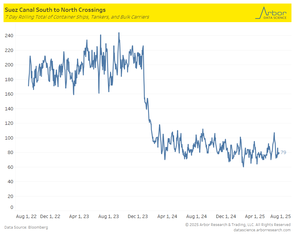 - The chart below outlines the 7-day rolling total of container ships, tankers, and bulk carriers traveling South to North through the Suez Canal.