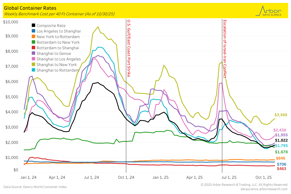 - The composite rate per 40-foot container was $1,822 on 10/30/2025, which is up $195 from 10/16/2025. Global container rates were mixed over the past two weeks. The largest increase was from Shanghai to New York which increased $332 to $3,568. The second-largest increase was from Shanghai to Los Angeles, which increased $243 to $2,438.