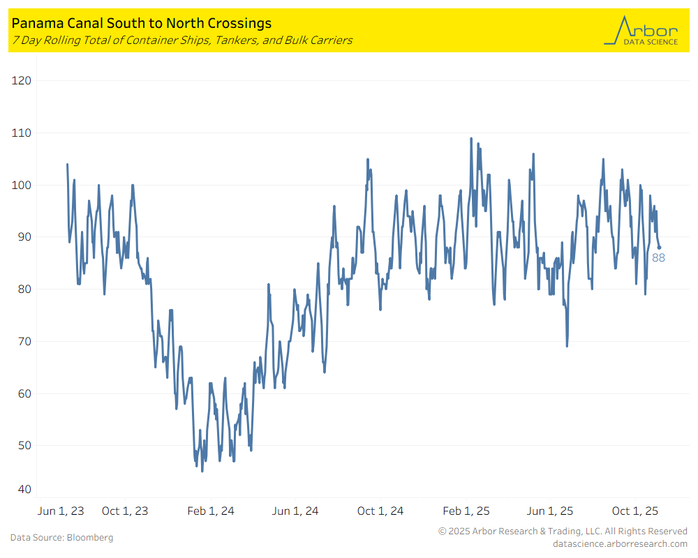- The chart below outlines the 7-day rolling total of container ships, tankers, and bulk carriers traveling South to North through the Panama Canal.