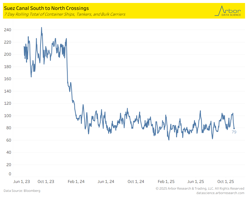 - The chart below outlines the 7-day rolling total of container ships, tankers, and bulk carriers traveling South to North through the Suez Canal.