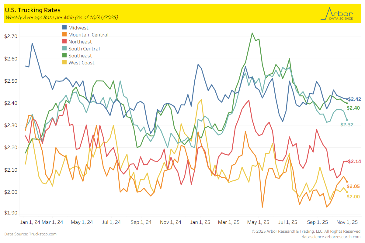 - Trucking rates on a geographical basis were mixed over the past two weeks. The largest increase was in the Northeast region which increased $0.06 to $2.14 per mile. The largest decrease was in the South Central region which decreased $0.05 to $2.32 per mile.