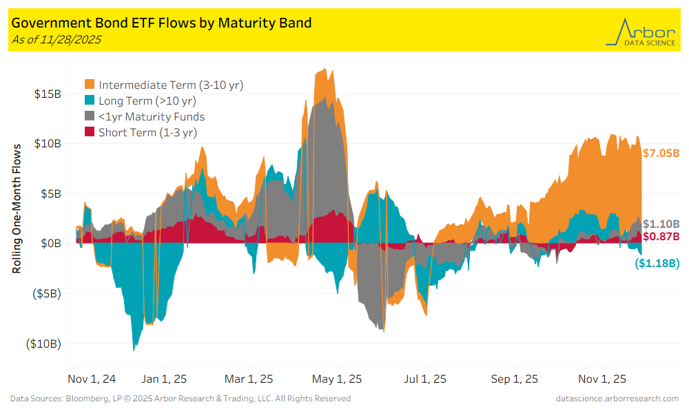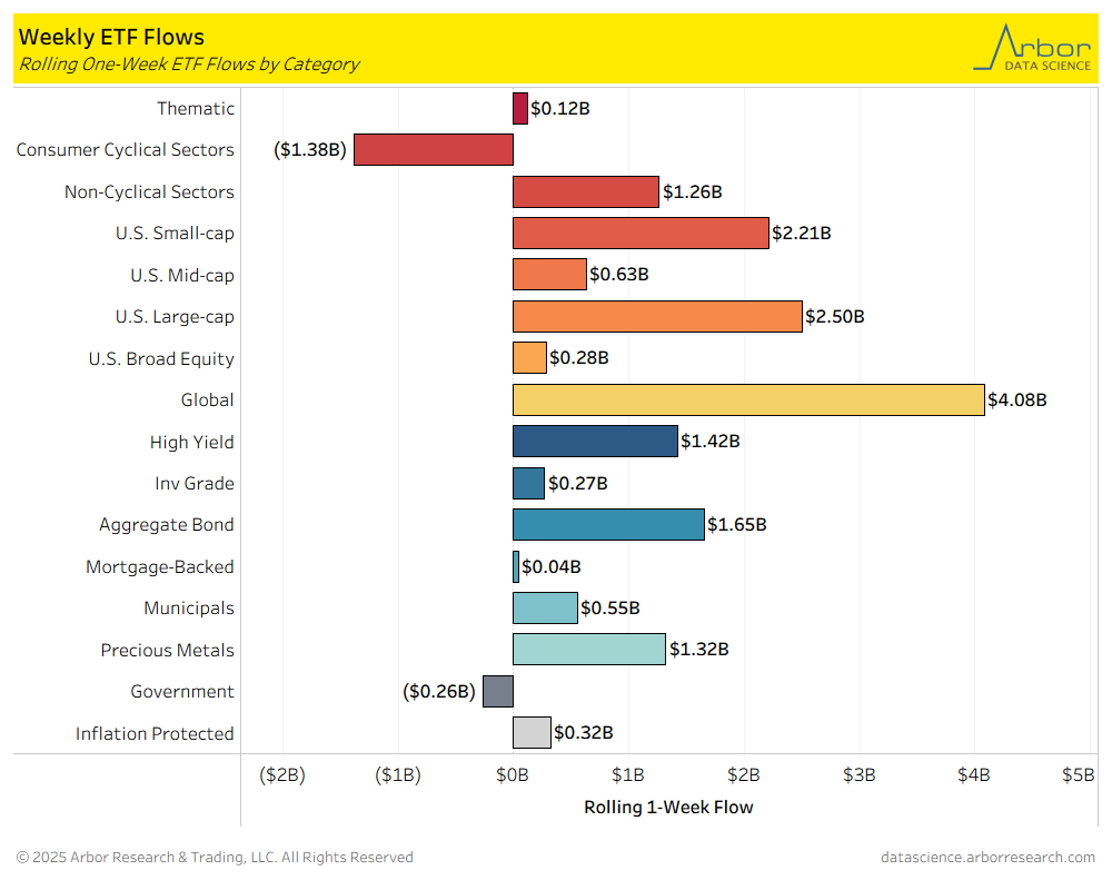 - Long Term (>10 yr) bond ETFs had outflows of $1.18 billion over the last week. The largest inflows were $7.05 billion in Intermediate Term (3-10 yr) ETFs.