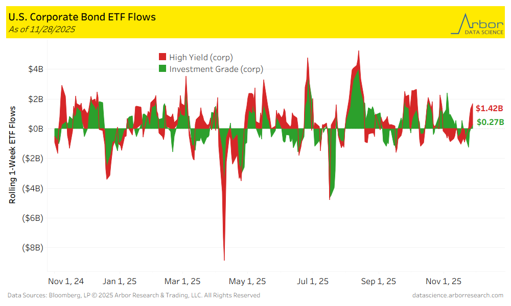 - Corporate bond ETF flows were positive for the week ended 11/28/2025, with High-Yield ETFs gaining $1.42 billion and Investment-Grade ETFs gaining $0.27 billion.
