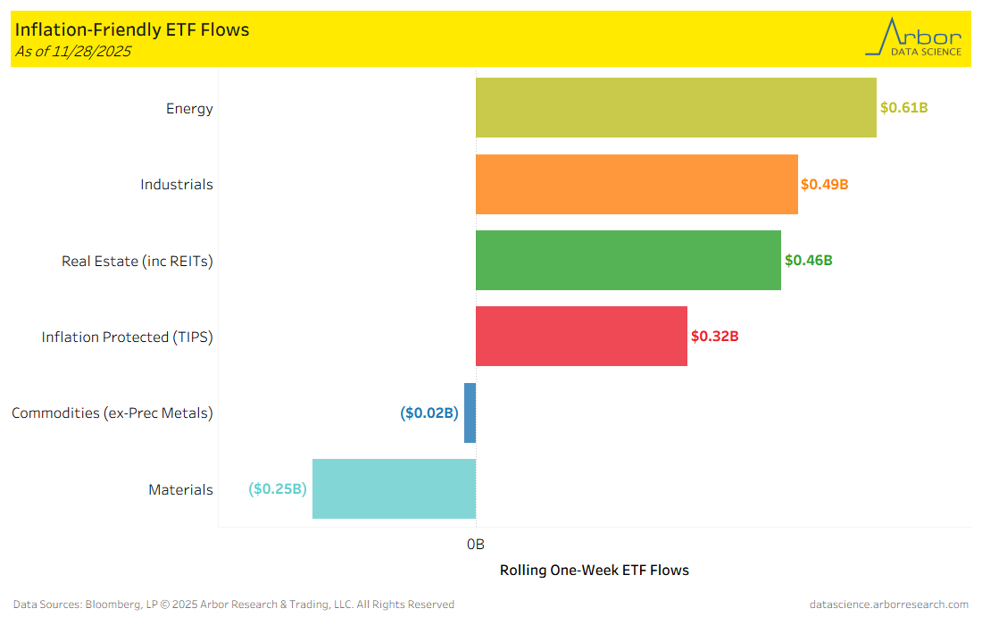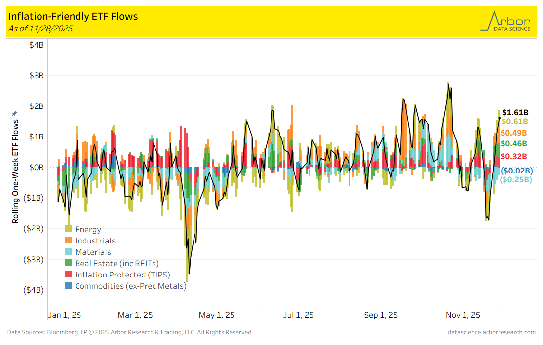 - Turning to inflation-friendly ETFs, aggregate flows (black line in chart below) were positive for the week ended 11/28/2025, with $1.61 billion of inflows. Energy had the largest inflow for the week at $0.61 billion.