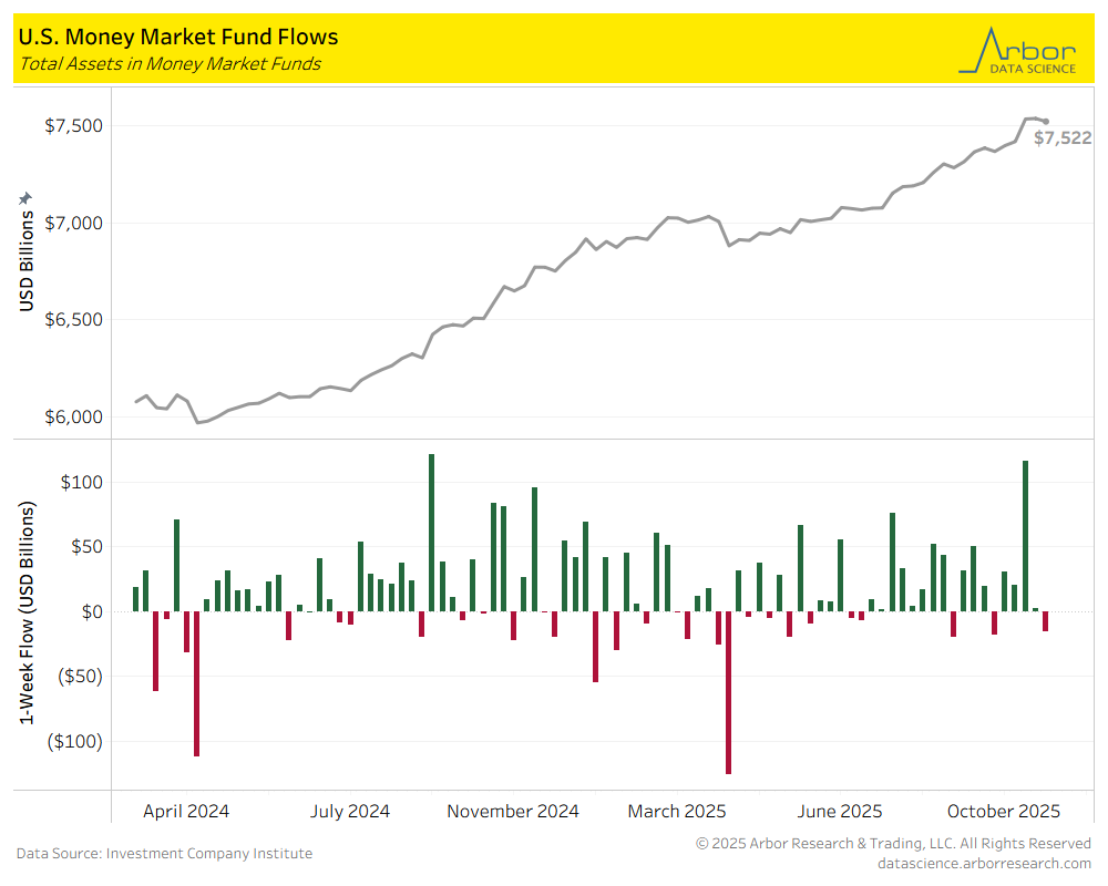- The amount invested in Money-Market Mutual Funds (MMMFs) decreased to $7.522 trillion in total assets on 11/19/2025, compared to $7.536 trillion in total assets on 11/12/2025.