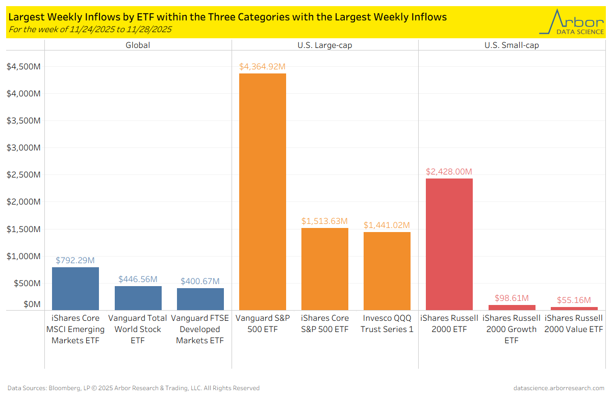- The three ETF categories with the largest inflows for the week that ended on 11/28/2025 were Global ETFs at $4.08 billion, U.S. Large-cap ETFs at $2.50 billion, and U.S. Small-cap ETFs at $2.21 billion.