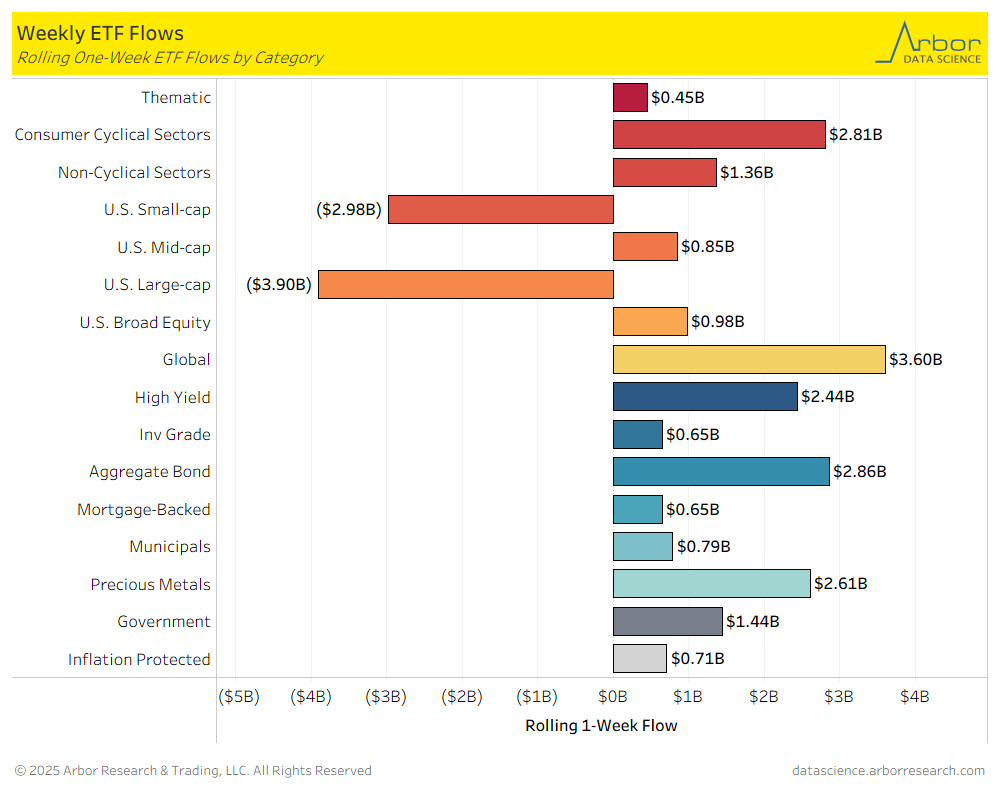 - The two ETF categories with the largest inflows for the week that ended on 10/3/2025 were Global ETFs at $3.60 billion, and Aggregate Bond ETFs, at $2.86 billion.